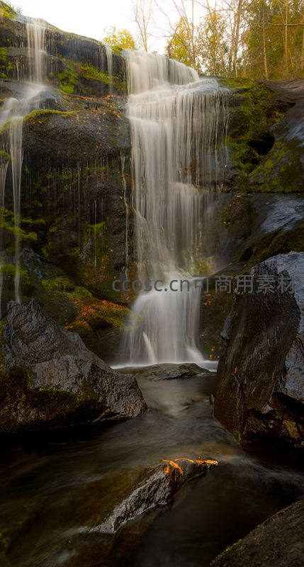 多级瀑布从湿滑岩壁层层跌落,水流在慢门下如丝绸般柔顺,散落的秋叶漂浮水面,为静谧山谷增添一抹暖色生机。