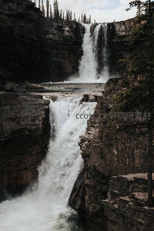 两道瀑布从陡峭岩壁飞流直下,激起层层白浪,四周松林密布,展现原始峡谷的雄浑与野性之美。