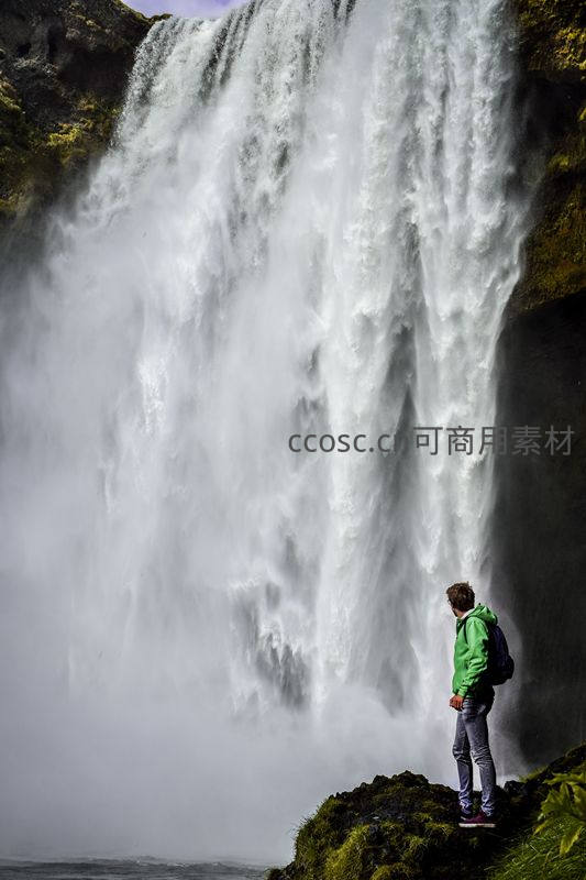 一位背包客伫立在瀑布前,仰望滔天水幕,水雾弥漫,人与自然形成强烈对比,凸显大自然的磅礴与人的敬畏之心。