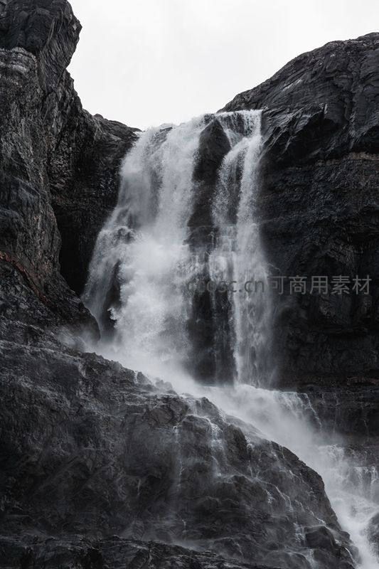 水流从陡峭的黑色岩壁倾泻而下,激起漫天水雾,展现大自然原始而磅礴的力量,令人敬畏。