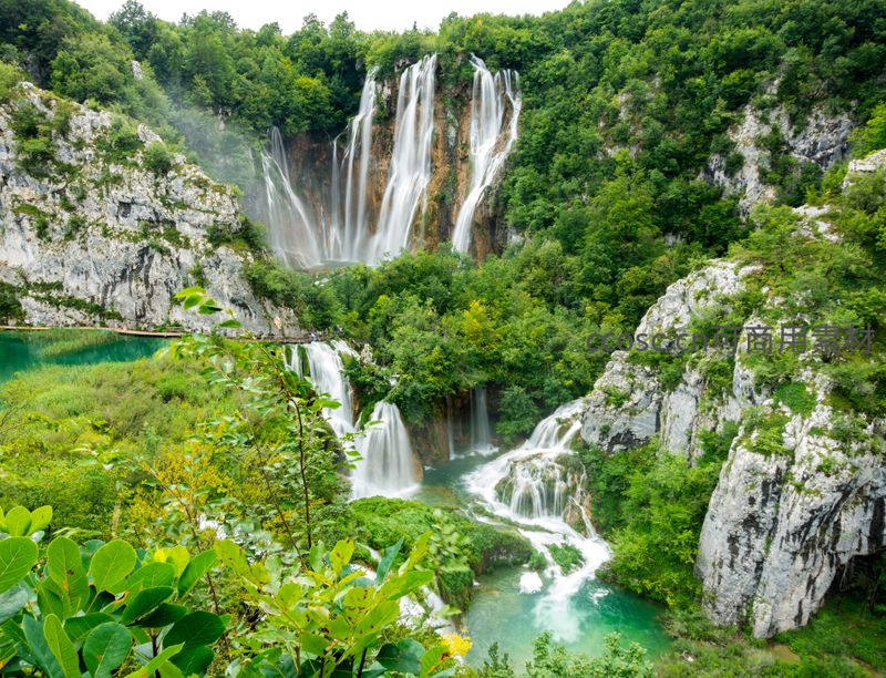 多级瀑布自山崖倾泻而下,汇入下方碧绿的湖泊,四周被茂密森林环绕,岩石嶙峋,构成一幅壮丽而宁静的山水画卷,是理想的度假胜地。