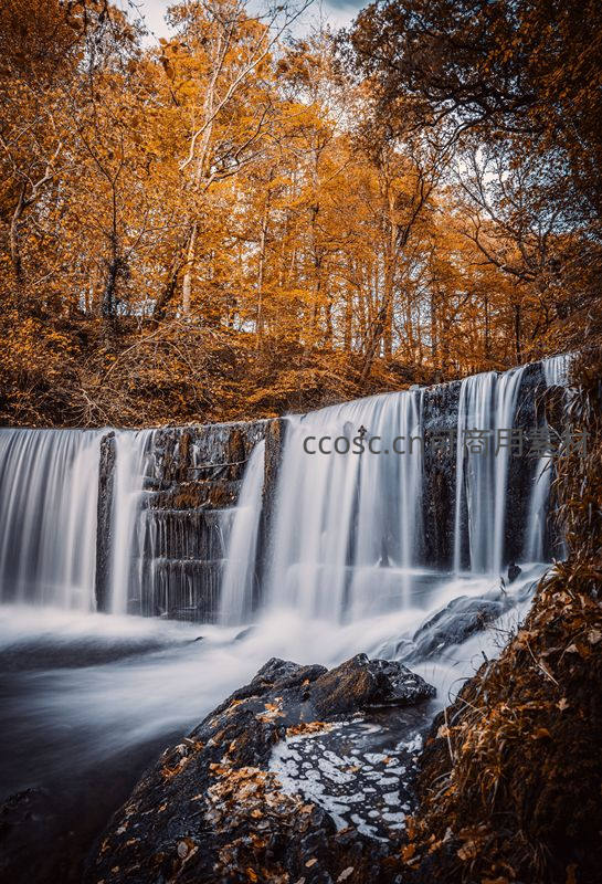 在绚烂的秋日森林中,一道瀑布从岩石上倾泻而下,水流因长曝光显得如丝绸般柔滑,周围落叶与金黄树叶构成一幅宁静而壮美的自然画卷。
