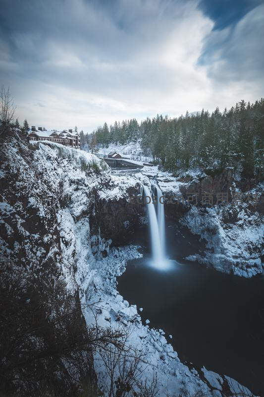 皑皑白雪覆盖着峡谷两岸,一道洁白的瀑布如丝带般垂落,周围松林静谧,远处小屋点缀,构成一幅纯净的冬日画卷。