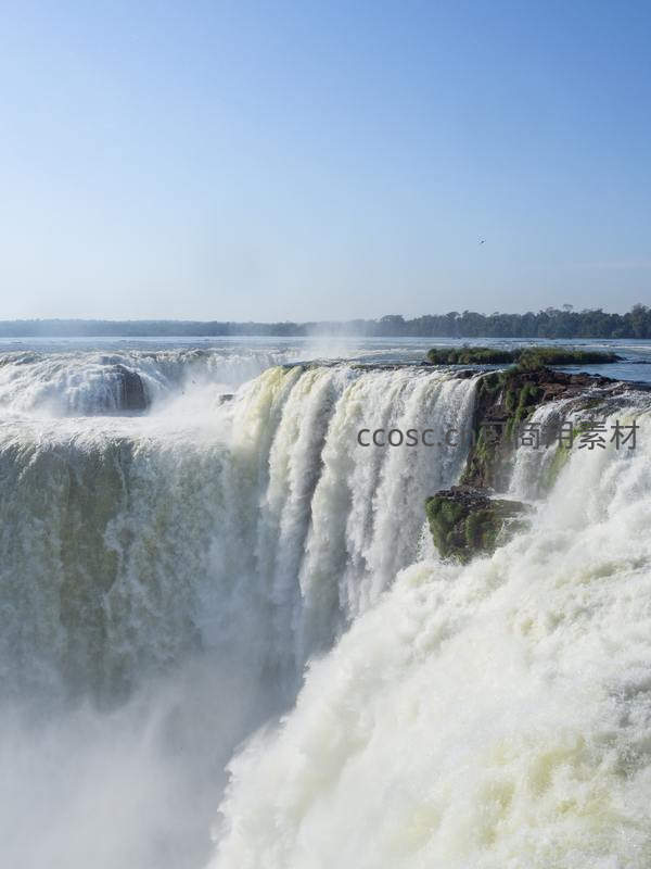宽阔的瀑布如白练般倾泻入河,激流翻滚水花冲天,背景是清澈湛蓝的天空与远处林带,画面充满力量感与纯净的自然美感。
