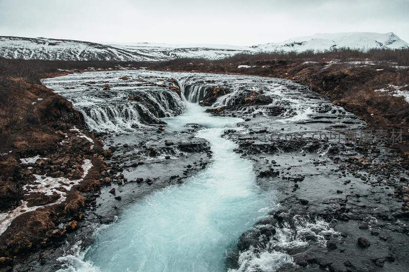 蓝绿色的冰川融水在黑色火山岩峡谷中蜿蜒流淌,形成层层叠叠的小型瀑布和急流,远处雪山连绵,展现原始荒野的地质奇观。