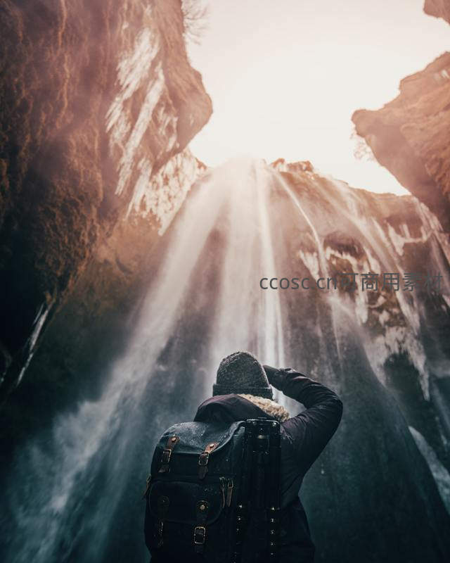 一位背着登山包的旅人站在巨大瀑布前,逆光中仰望飞溅的水花和穿透云层的阳光,画面充满探索未知的冒险精神与敬畏感。