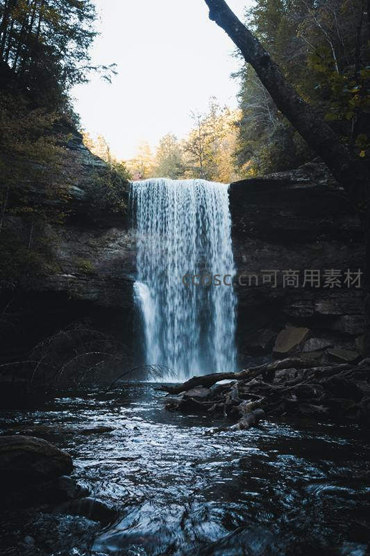 一道宽阔的瀑布在幽深的林间峡谷中垂直落下,阳光透过树冠洒在水面上,前方散落着粗壮的树根与卵石,氛围宁静而神秘。