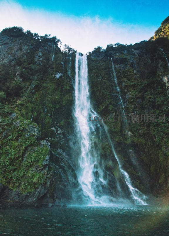 瀑布从高耸入云的悬崖顶端奔涌而下,水柱如白练般划破晴空,底部激起层层水雾,与蔚蓝天空形成鲜明对比,气势磅礴。