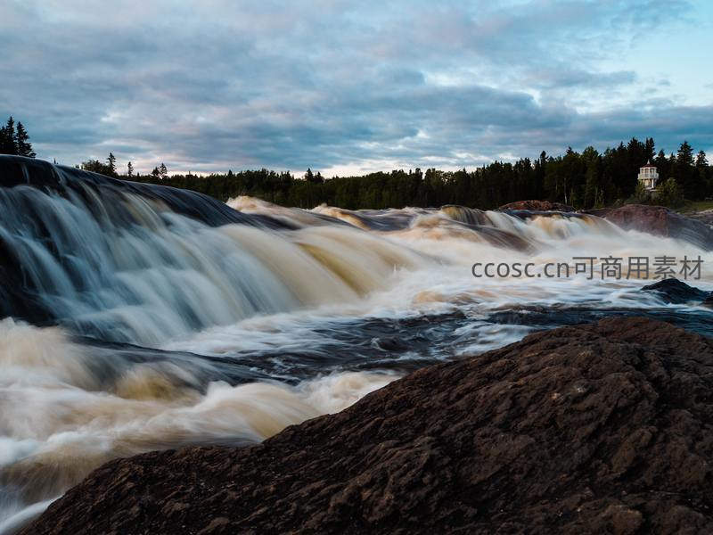 在黄昏的柔和光线下,湍急的河水从黑色岩层倾泻而下,激起白色浪花,远处是茂密的森林和一座小屋,展现了壮丽的自然力量。