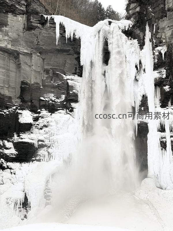 冬季峡谷中,瀑布被严寒凝固成壮观的冰柱与冰帘,水流在冰层下奔涌,周围岩壁覆盖白雪,展现出大自然的鬼斧神工与宁静之美。