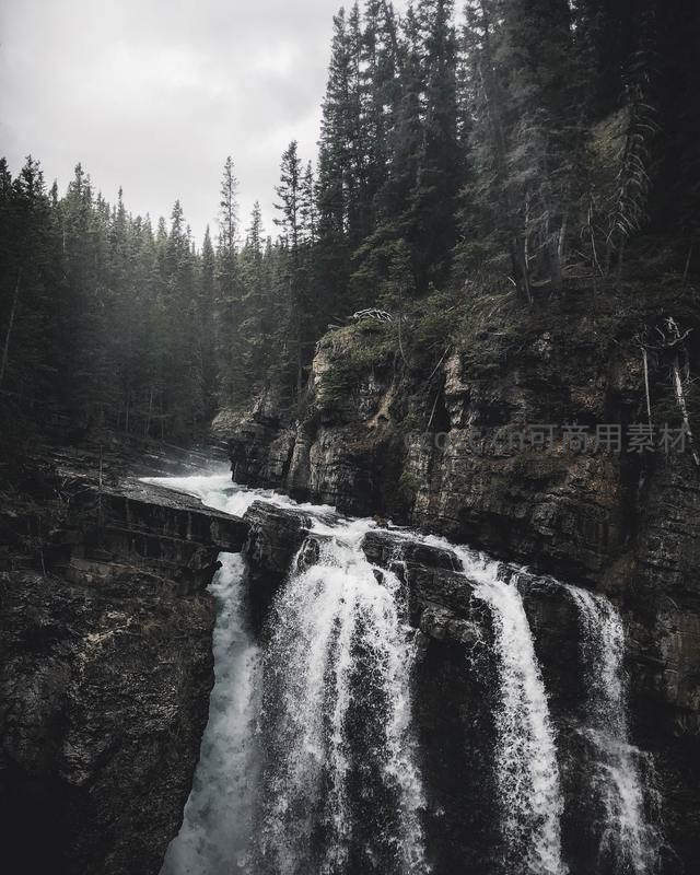 高耸的针叶林环绕着陡峭的岩壁,一道激流从高处倾泻而下,水花四溅,雾气弥漫,营造出原始、粗犷而充满生命力的自然画卷。