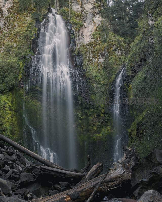 茂密的植被覆盖着陡峭山崖,两条瀑布从高处飞流直下,在布满青苔的岩石间形成柔滑水幕,下方枯木横卧,增添野趣与岁月痕迹。
