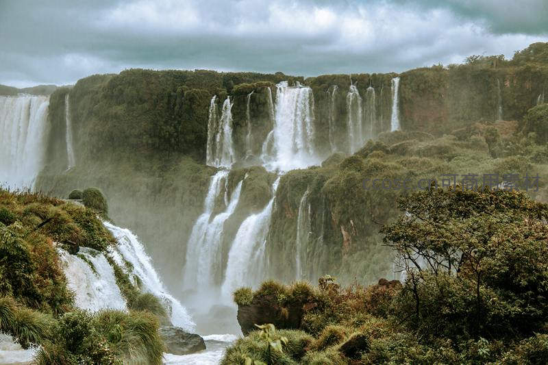 广袤的悬崖边缘,数十道瀑布同时奔腾而下,激起漫天水雾弥漫于葱郁丛林之上,天空阴云低垂,更显其宏伟磅礴,令人叹为观止。