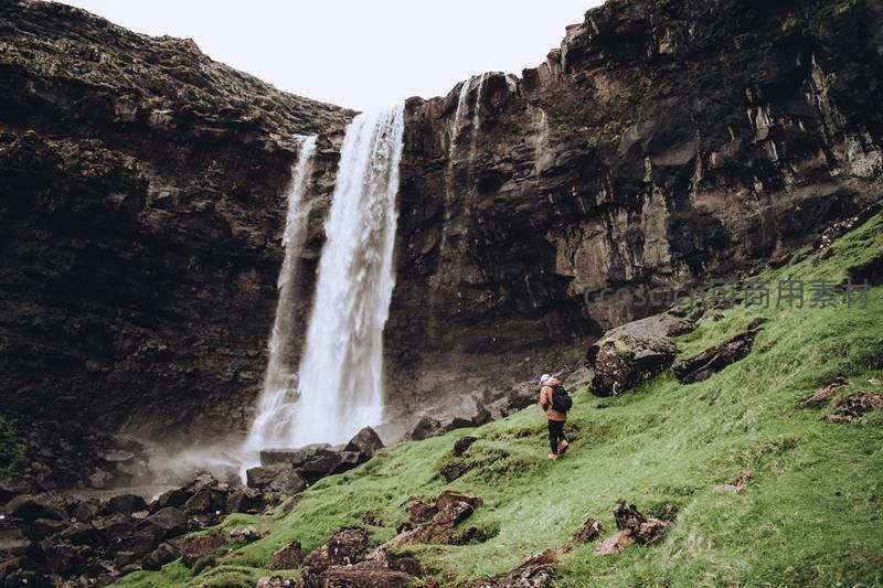旅人驻足仰望悬崖瀑布,绿坡如毯