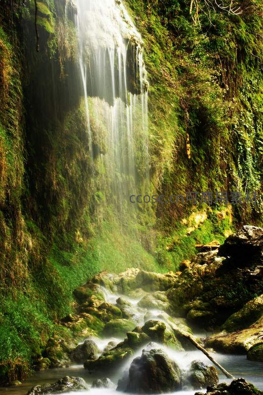 苔藓覆盖岩壁上的细流瀑布,光影斑驳