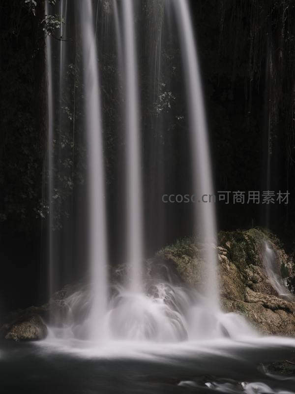 在幽深的洞穴环境中,多股细长的瀑布在慢门下呈现出如丝绸般的质感,水流温柔地注入下方水面,营造出神秘而宁静的氛围。