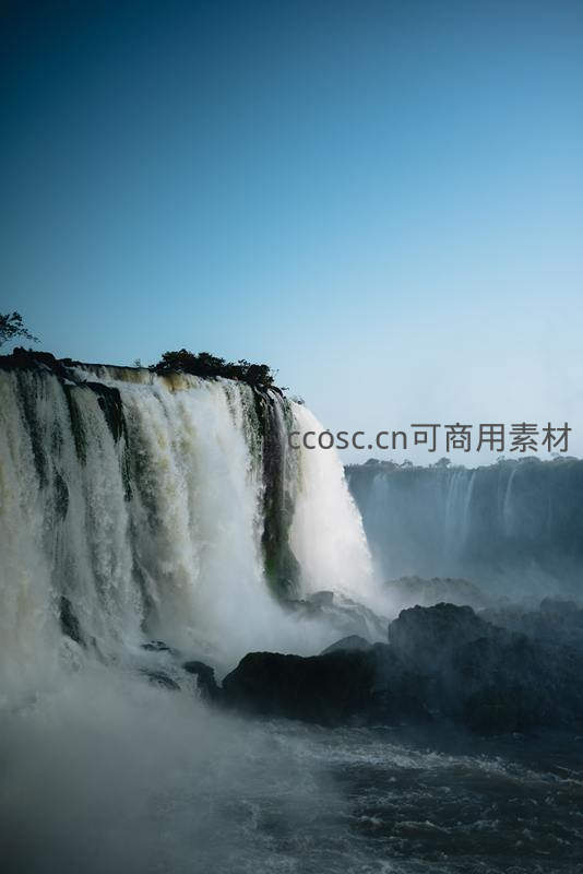 巨大的瀑布在湛蓝天空下奔涌直下,撞击深潭激起冲天水雾,展现大自然无与伦比的力量与纯净之美。