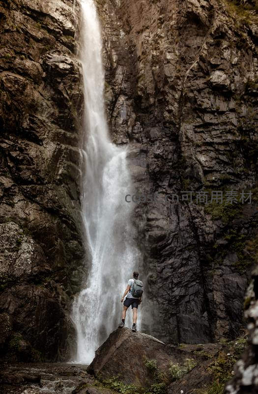 一名背包客独自站在嶙峋巨石上,背对镜头,仰望从险峻峭壁垂直坠落的巨大瀑布,水声轰鸣,彰显人与自然的渺小与敬畏之情。