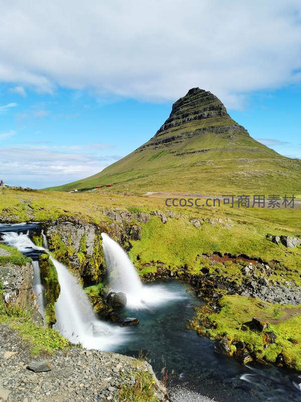 标志性的锥形草帽山巍然耸立,山脚下溪流蜿蜒,在青翠苔藓覆盖的岩石上形成数道小型瀑布,水流轻柔,蓝天白云映衬,宛如童话世界。