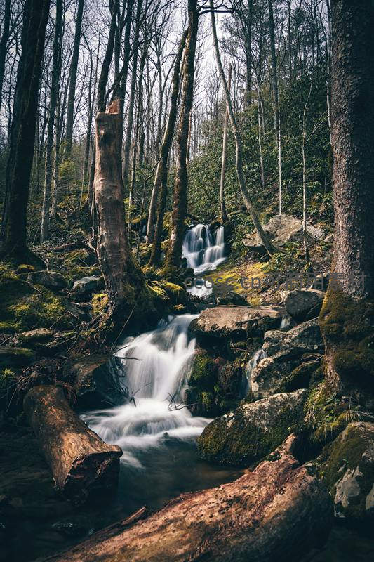 在一片寂静的落叶林中,一条溪流蜿蜒穿过布满苔藓的岩石,形成多级小型瀑布。几根倒伏的枯木横亘其间,为画面增添沧桑感,慢门水流更显灵动与神秘。