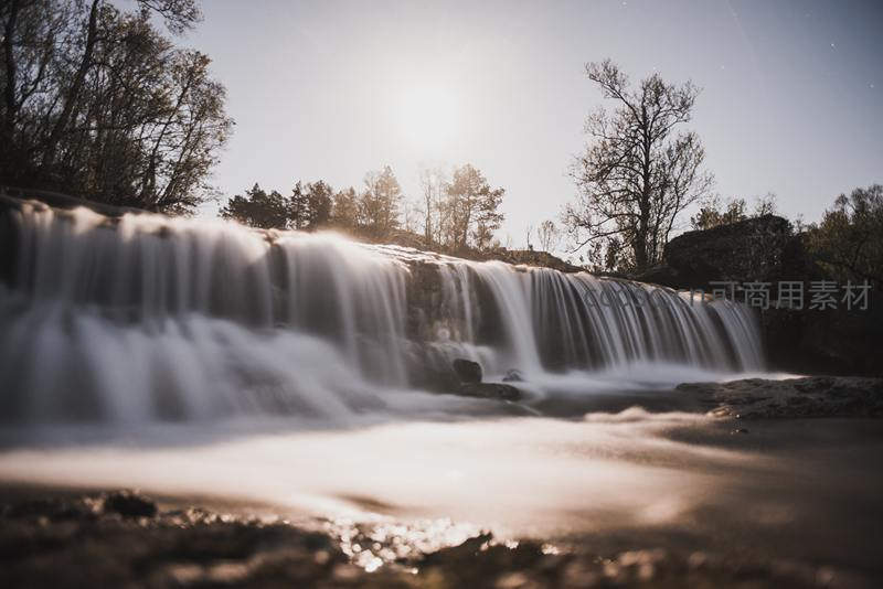 夕阳西下,金色的阳光温柔地洒在宽阔的瀑布上,水流在长曝光下如丝绸般柔滑,倒影粼粼,营造出温暖而梦幻的黄昏意境。