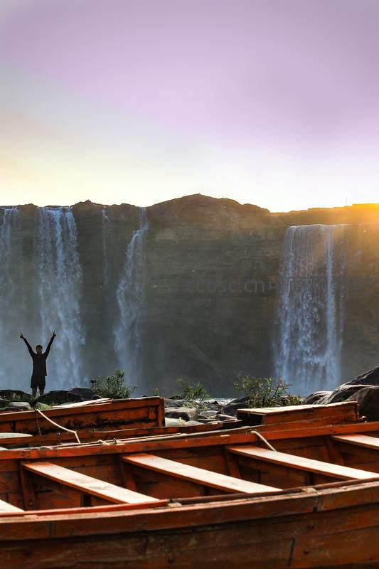 在壮丽的瀑布前,一位旅人张开双臂迎接夕阳,身后是奔腾的水流和停泊的木船,构成一幅震撼人心的自然与人文画卷。