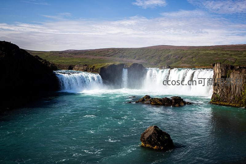 多股瀑布自高崖奔涌而下,汇入前方碧绿河湾,两岸草坡起伏,远处山峦连绵,展现大自然磅礴气势与和谐之美。