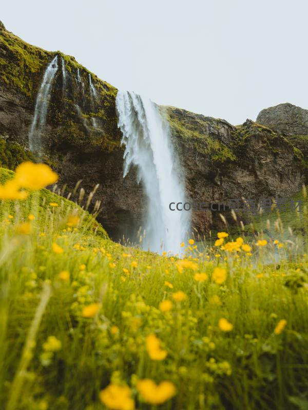 前景是大片盛开的黄色野花和嫩绿草地,焦点后移至远处从苔藓覆盖山崖倾泻而下的巨大瀑布,营造出清新而富有层次的视觉效果。