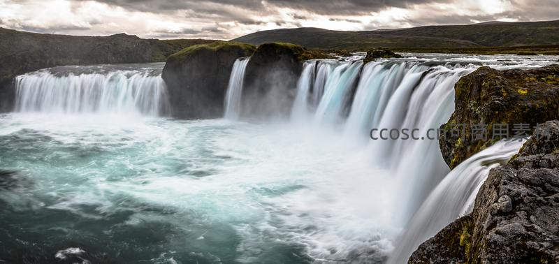 多股激流从布满苔藓的黑色岩石上奔涌而下,汇成一片汹涌的白色水幕,长曝光技法使水流如丝绸般柔滑,气势恢宏。