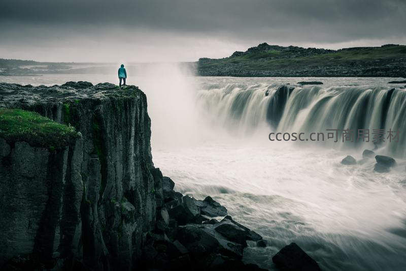 一人独自站在陡峭的悬崖边缘,远眺前方被水雾笼罩的广阔瀑布群,灰暗天空下更显苍茫辽阔,充满史诗般的孤独感。