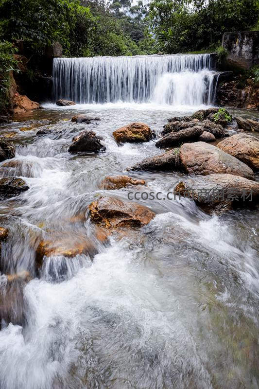 清澈溪水在布满苔藓的岩石间奔涌流淌,前方形成一道小型瀑布,水花飞溅晶莹剔透,长曝光效果让水流呈现柔滑绸缎般的质感。