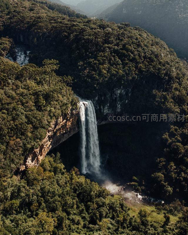 从高空俯瞰,一条瀑布自茂密森林覆盖的悬崖峭壁飞流直下,周围群山连绵,绿意盎然,展现出大自然鬼斧神工的壮阔之美。