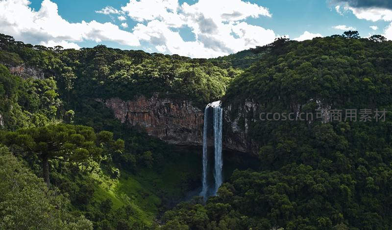 从高空俯瞰,一道壮观的瀑布从悬崖峭壁直落深谷,四周被郁郁葱葱的森林环绕,蓝天白云衬托下更显其雄伟气势与自然之美。