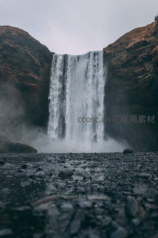 在灰蒙天空下,巨大的瀑布从陡峭岩壁奔涌而下,激起漫天水雾。前景是湿漉漉的黑色卵石滩,更显水流之猛烈与自然之力的震撼。
