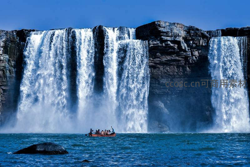 壮观的瀑布从高崖倾泻而下,水花四溅形成朦胧水雾,一艘小船载着游客在前方水面缓缓行驶,蓝天映衬下宛如人间仙境。