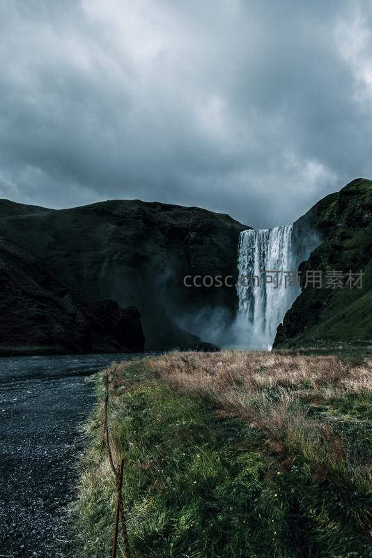 厚重乌云笼罩山谷,一道洁白瀑布从峭壁垂落,水雾升腾与灰暗天空交融,前景草地与碎石小径增添荒野气息,意境苍茫。
