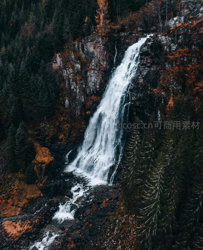 高耸的瀑布从陡峭岩壁倾泻而下,周围环绕着深绿与橙红交织的秋日树林,水花四溅,气势磅礴,展现大自然鬼斧神工之美。