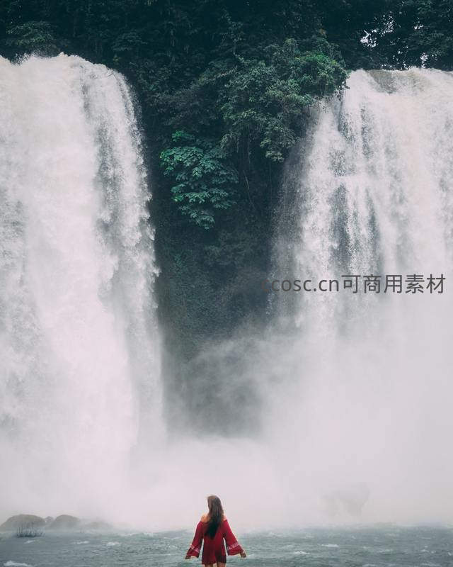红衣女子背对镜头,置身水雾弥漫的巨瀑前