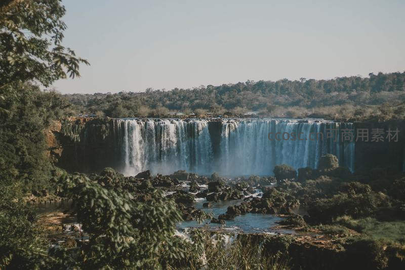 在明媚阳光照耀下,伊瓜苏瀑布的水流显得格外晶莹剔透,溅起的水花在空中飞舞,前景的岩石与绿树衬托出瀑布的雄伟,构成一幅动人的自然画卷。