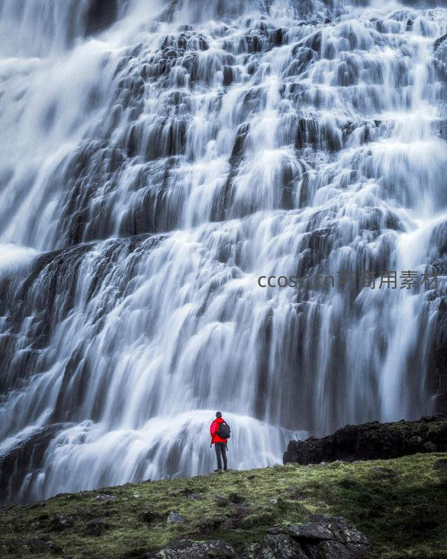 一位身穿红色外套的旅者站在草坡上,凝视眼前层层叠叠、如丝绸般流淌的瀑布,水声轰鸣,人影渺小却充满探索精神。