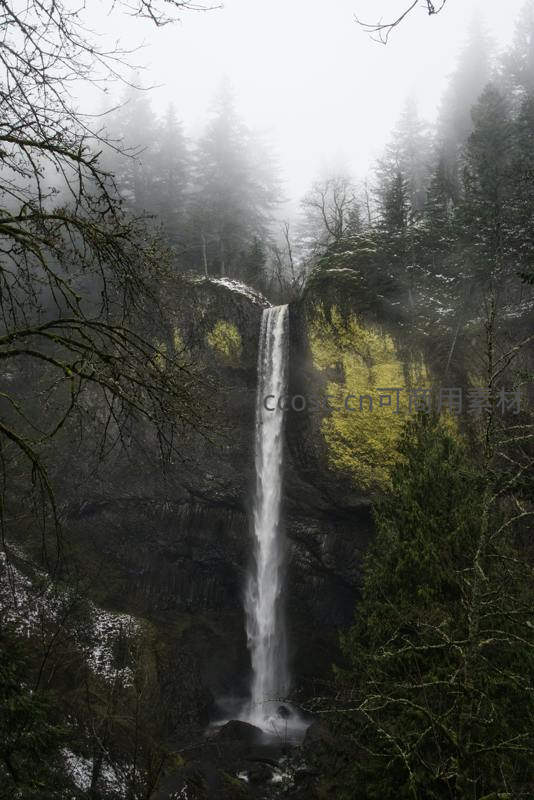 高耸的瀑布从布满青苔的悬崖倾泻而下,四周被浓雾笼罩的针叶林环绕,营造出神秘而静谧的自然氛围。