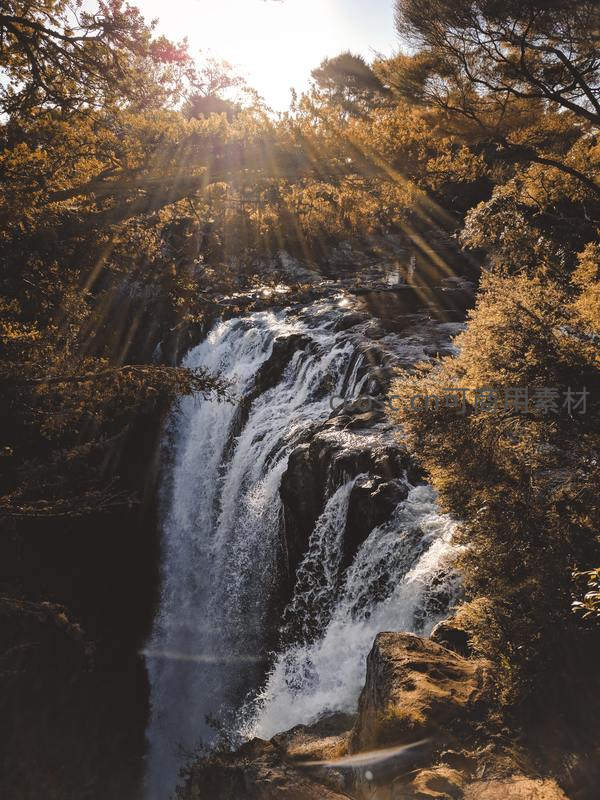 金色阳光穿过茂密树冠洒在飞溅的水花上,形成耀眼光束,为湍急的瀑布与嶙峋岩石披上温暖而壮丽的外衣。