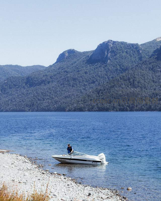 一艘白色快艇停靠在布满鹅卵石的湖岸,一位游客正准备登船,背后是连绵起伏、覆盖着茂密森林的巍峨山脉,展现壮丽的自然与休闲结合场景。