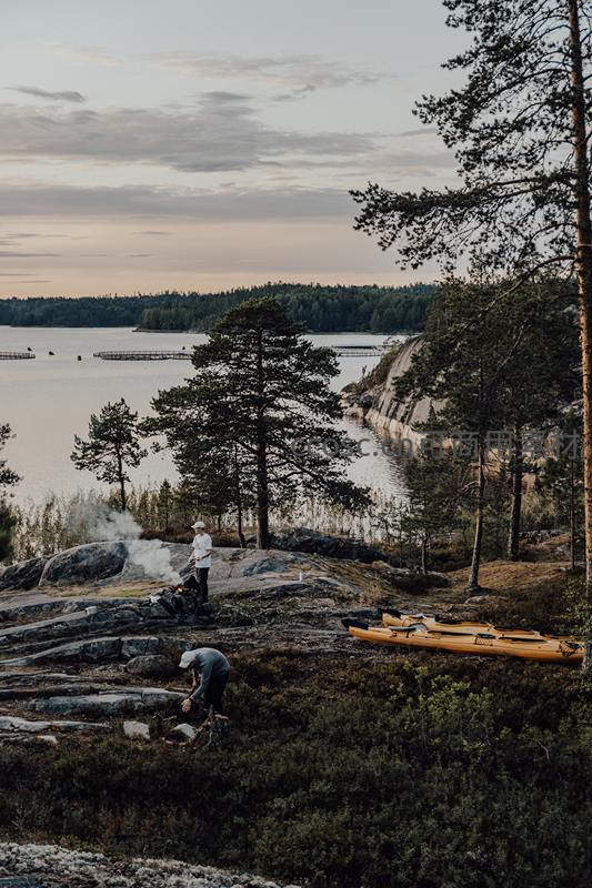 在暮色渐浓的湖岸岩石上,两位露营者正在生火做饭,旁边停放着黄色皮划艇,远处湖面与森林相接,展现出原始自然中惬意的野外生活场景。