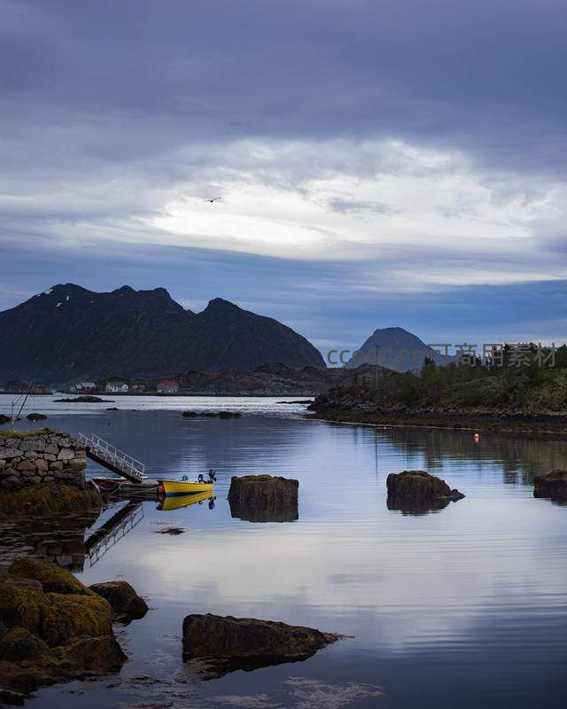 峡湾小舟伴山峦倒影
