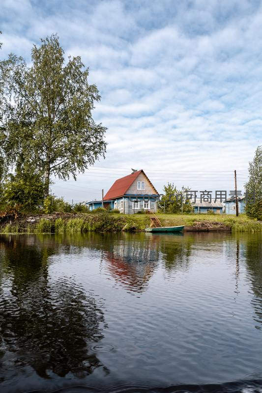 湖边蓝屋倒影如画