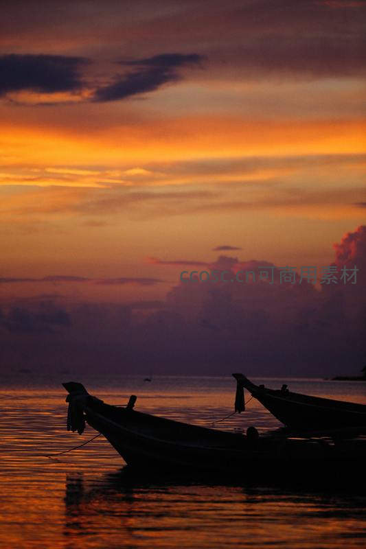 两艘渔船静静停泊在海上,被绚烂的晚霞映照成黑色剪影,海面波光粼粼,充满诗意与宁静。