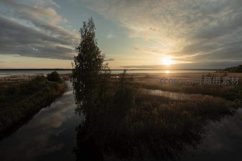 夕阳的余晖洒满天际,将云层染成金色,一棵孤树伫立水边,其剪影与天空的绚烂色彩一同倒映在平静的河面上,构成一幅诗意的黄昏画卷。