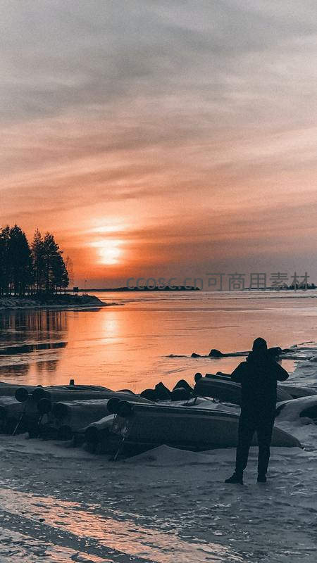 在冰封的湖畔,一个人静静伫立,凝望着远方地平线上沉落的夕阳。橙红色的霞光铺满冰面,与岸边的积雪和沉默的人影共同构成一幅冬日静谧图景。