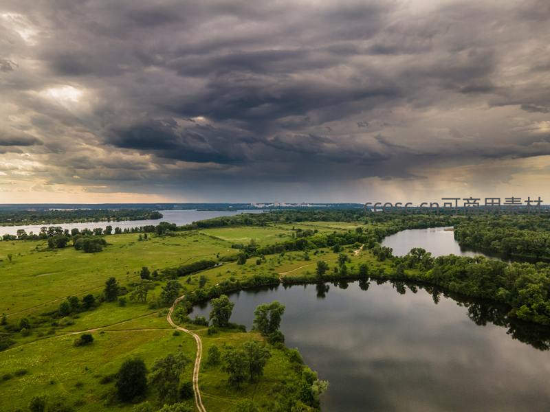 乌云压境,航拍河湾绿野